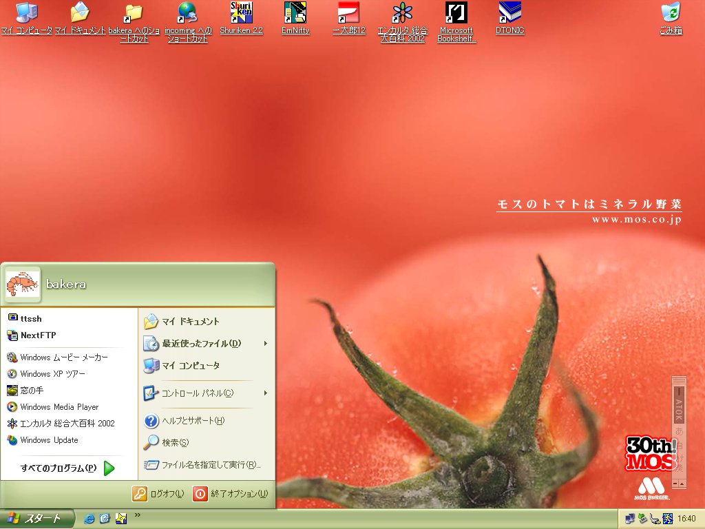 - 一太郎12をインストール……する前に、Justsystem の登録ユーザ ID が必要なことに気づく。一太郎12には CD ケースに貼るシールが無かったので、メモってなかったのだ。Justsystem のウェブサイト (www.justsystem.co.jp)に行って、ユーザ ID を bakera@star.email.ne.jp にメーってもらう。ついでにインターネットディスク (www.idisk-just.com)のパスワード変更申請もしておく。